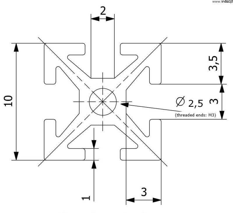 Šířka a výška MakerBeam = 10 mm x 10 mm. Naše profily jsou k dispozici v různých velikostech. Hliníkové profily jsou eloxované v černé nebo stříbrné barvě, mají duté jádro a na obou koncích otvory se závitem.
