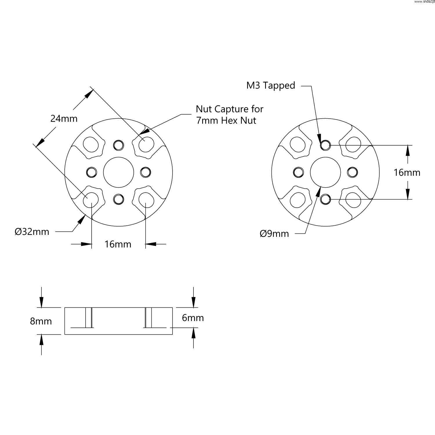 Otvory se závitem M3 jsou zarovnány se vzorem REV, který uvnitř měří 16 mm. Tyto otvory umožňují snadno připevnit téměř jakýkoli díl REV, který má průchozí otvory.