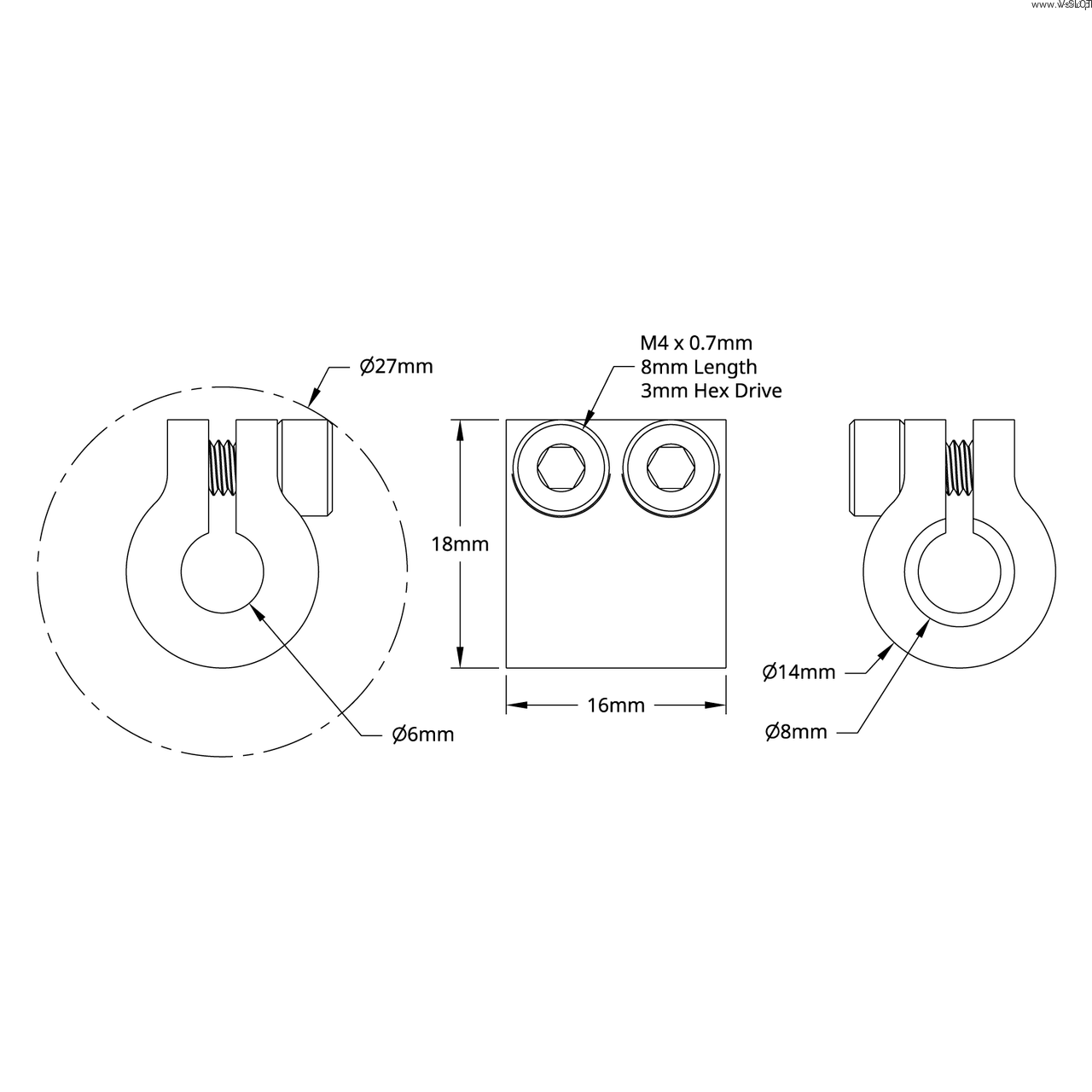 Tyto spojky jsou kompaktní a vytvářejí pevné spojení mezi oběma hřídeli. Upínací šrouby mají velikost M4 a pasují na imbusový klíč 3 mm.