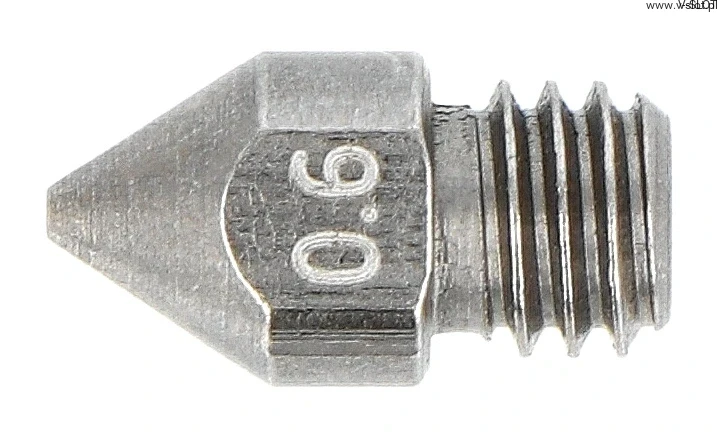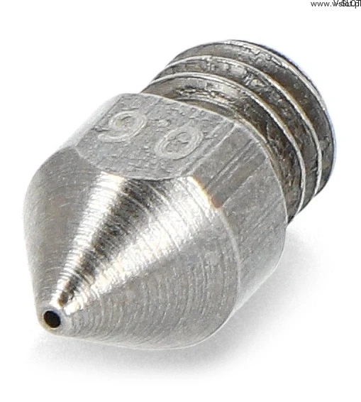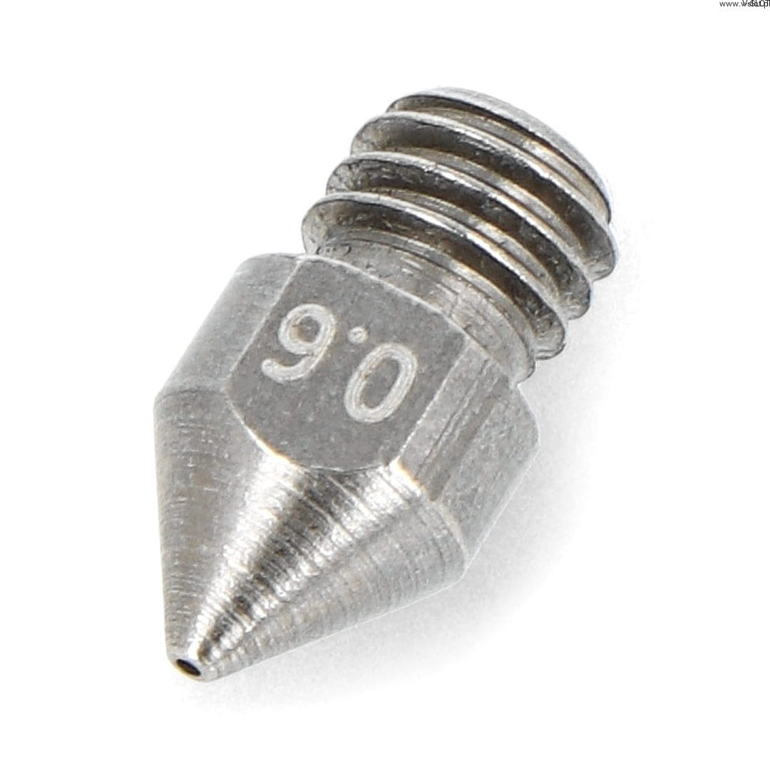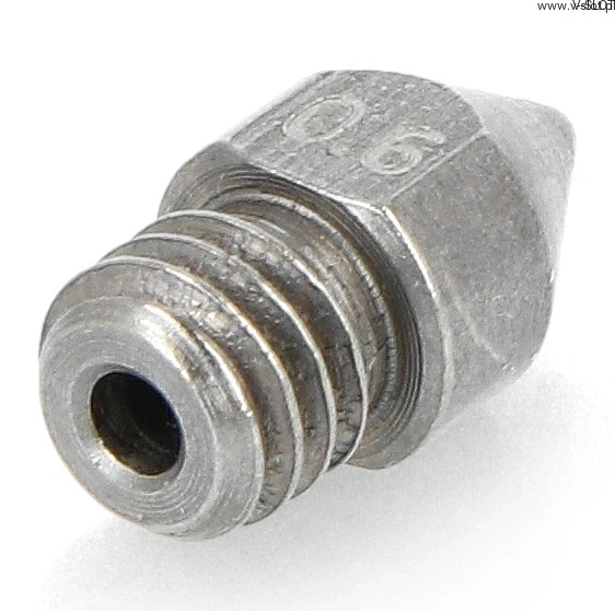 Wykonana z wysokiej jakości stali hartowanej, dysza z otworem o średnicy 0,6mm. Kompatybilna z większością głowic hotend wykorzystywanymi w drukarkach 3D FDM. Współpracuje z filamentami o średnicy 1,75mm. Jest to końcowy element na głowicy hotend. Jakość dyszy ma bezpośredni wpływ na końcową jakość wydruku. To przez nią roztopiony filament nanoszony jest na powierzchnię stołu roboczego. Jest to zakup długoterminowy, zakupiona dysza będzie służyła długie lata.