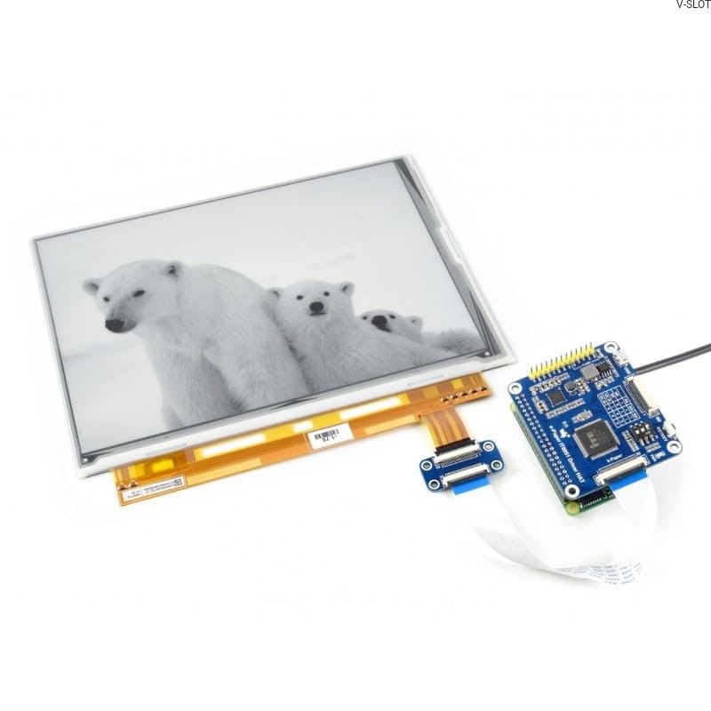 Tento displej je 9,7palcovĂ˝ e-paper s technologiĂ E-Ink a rozlišenĂm 1200 x 825 pixelĹŻ. Pracuje pĹ™i napÄ›tĂ 5 V a mĹŻĹľe komunikovat prostĹ™ednictvĂm rozhranĂ SPI/180/I2C/USB. Tento typ displeje je ideálnĂ pro ÄŤtenĂ elektronickĂ˝ch knih a elektronickĂ˝ch ÄŤasopisĹŻ. SoučástĂ tohoto displeje je pĹ™ekryvnĂ˝ modul HAT pro Raspberry Pi, ale modul je kompatibilnĂ i s jinĂ˝mi minipoÄŤĂtaÄŤi, napĹ™Ăklad Nucleo. DĹŻleĹľitĂ© je, Ĺľe displeje tohoto typu majĂ velmi nĂzkou spotĹ™ebu energie.