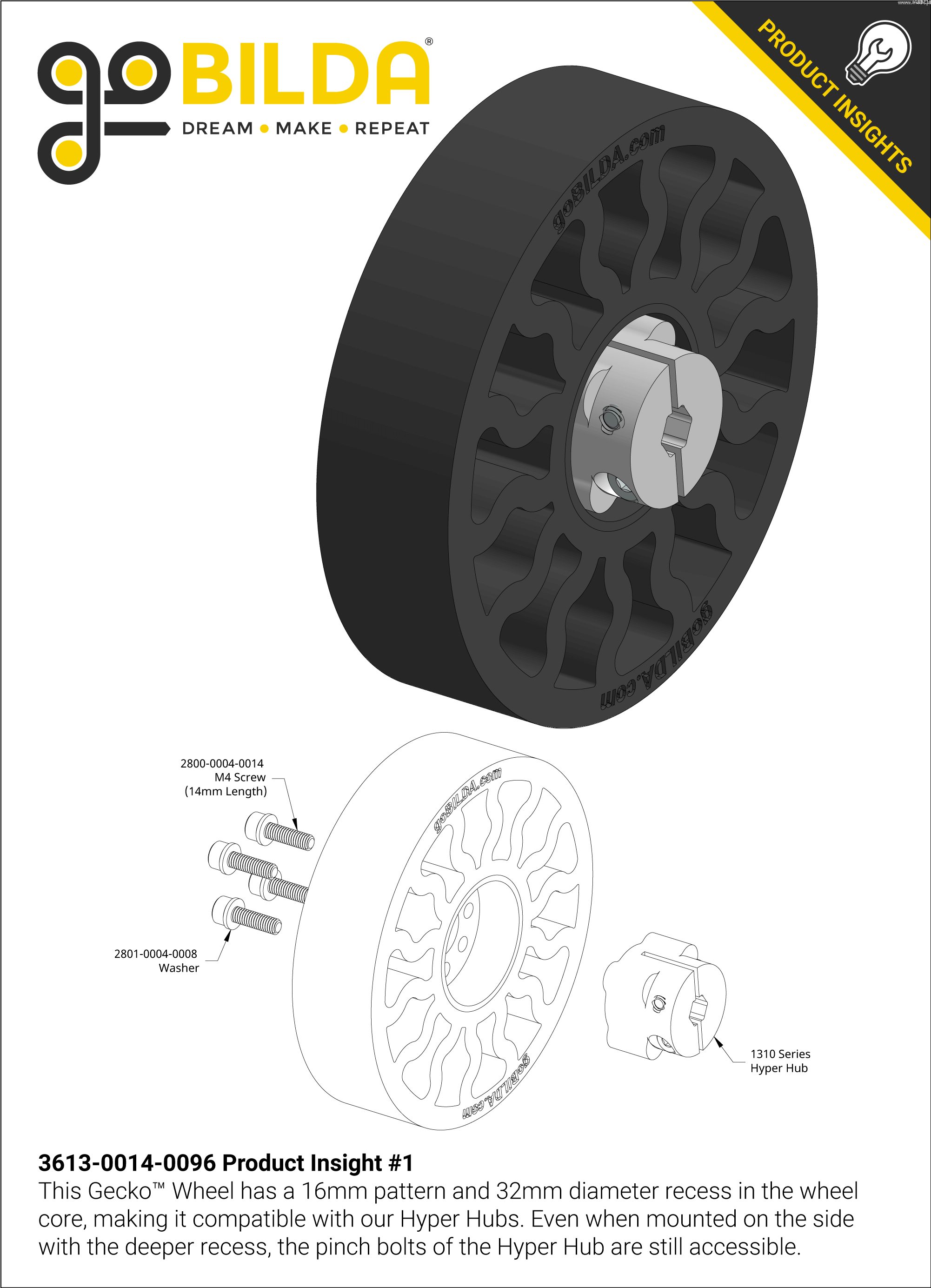 Tato 96mm kolečka Gecko jsou vyrobena z vysoce přilnavé silikonové gumy, která zajišťuje vynikající trakci na mnoha površích. Konstrukce paprsků umožňuje, aby se kolečka snadno stlačila a přizpůsobila předmětům. Kolečka jsou nesměrová, což znamená, že poskytují stejně spolehlivé výsledky bez ohledu na směr otáčení. Plastové jádro umožňuje nastavit polohu kolečka jeho překlopením. Jedna strana má 8mm pokles, aby dokonale zapadla do náboje Sonic, zatímco druhá strana má hloubku 12 mm. Díky přilnavosti a designu na míru je toto kolečko dokonalým doplňkem vašeho týmu goBILDA.