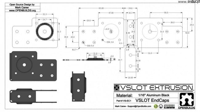 Montážní otvory na koncových dílech jsou od sebe vzdáleny 20 mm, což umožňuje snadné připojení k desce Mini V a profilu V-Slot.