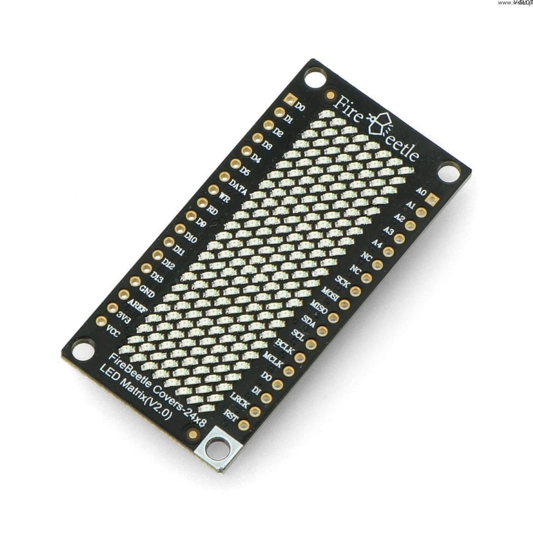 Pole LED FireBeetle Covers se skládá ze 192 ÄŤervenĂ˝ch LED diod uspořádanĂ˝ch do 8 Ĺ™ad a 24 sloupcĹŻ s moĹľnostĂ individuálnĂ adresy kaĹľdĂ© LED diody dĂky ovladaÄŤi HT1632C. Displej je vybaven 256kHz RC hodinami a podporuje 16stupĹovou stupnici jasu pro ještÄ› lepšà vizuálnĂ efekty v rĹŻznĂ˝ch elektronickĂ˝ch projektech. LED matice FireBeetle Covers je kompatibilnĂ s Ĺ™adou FireBeetle spoleÄŤnosti DFRobot a takĂ© s deskami Arduino.