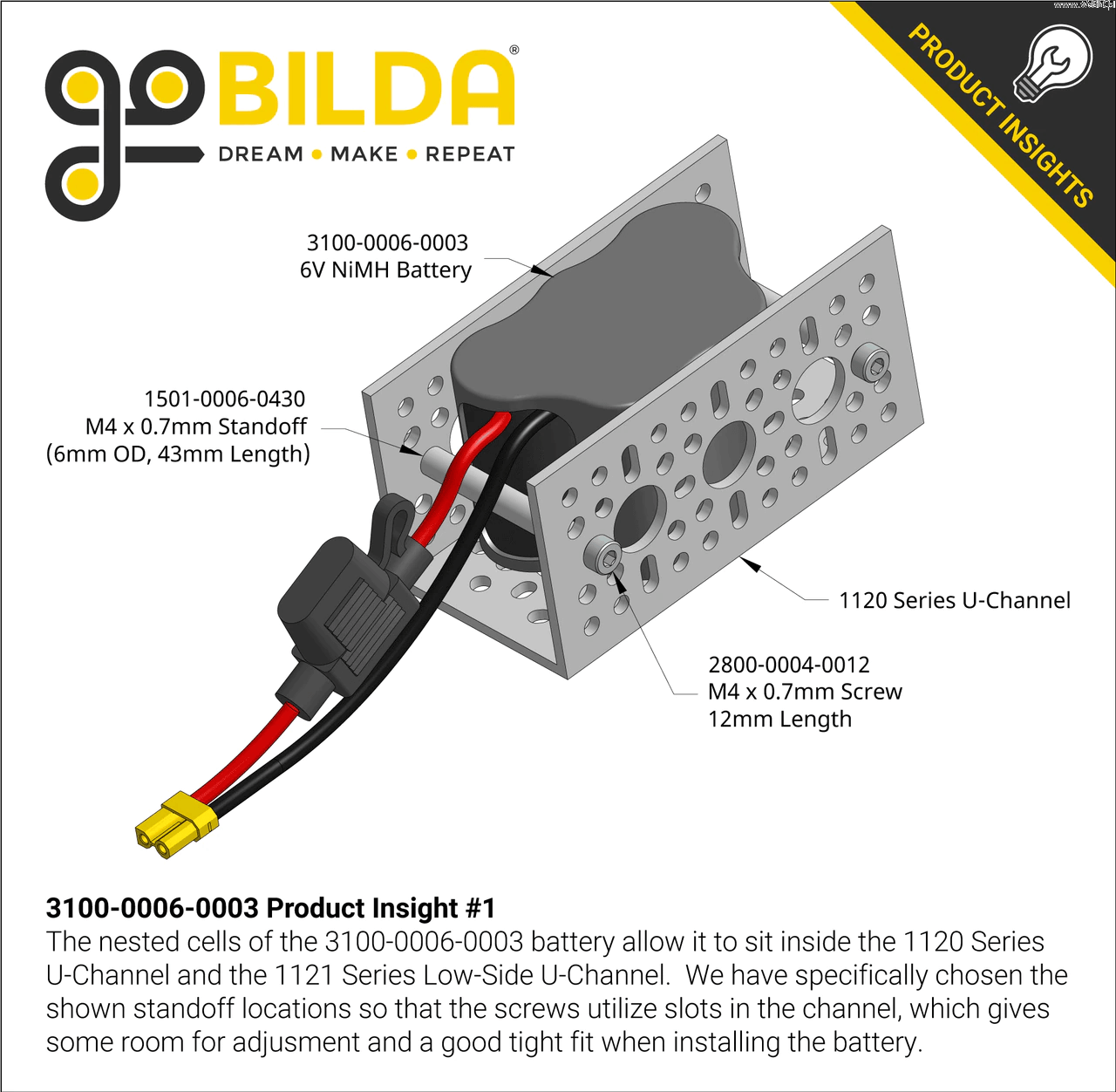 Tato 6V baterie obsahuje pět článků sub-C s kapacitou 3000 mAh zapojených do série. Velký silikonový vodič má zabudovaný držák miniaturní nožové pojistky s instalovanou 20A pojistkou. Konektor XT30 poskytuje bezpečné připojení v malém balení. Akumulátor je široký pouze 43 mm, což umožňuje jeho zasunutí do U-profilu řady 1120.