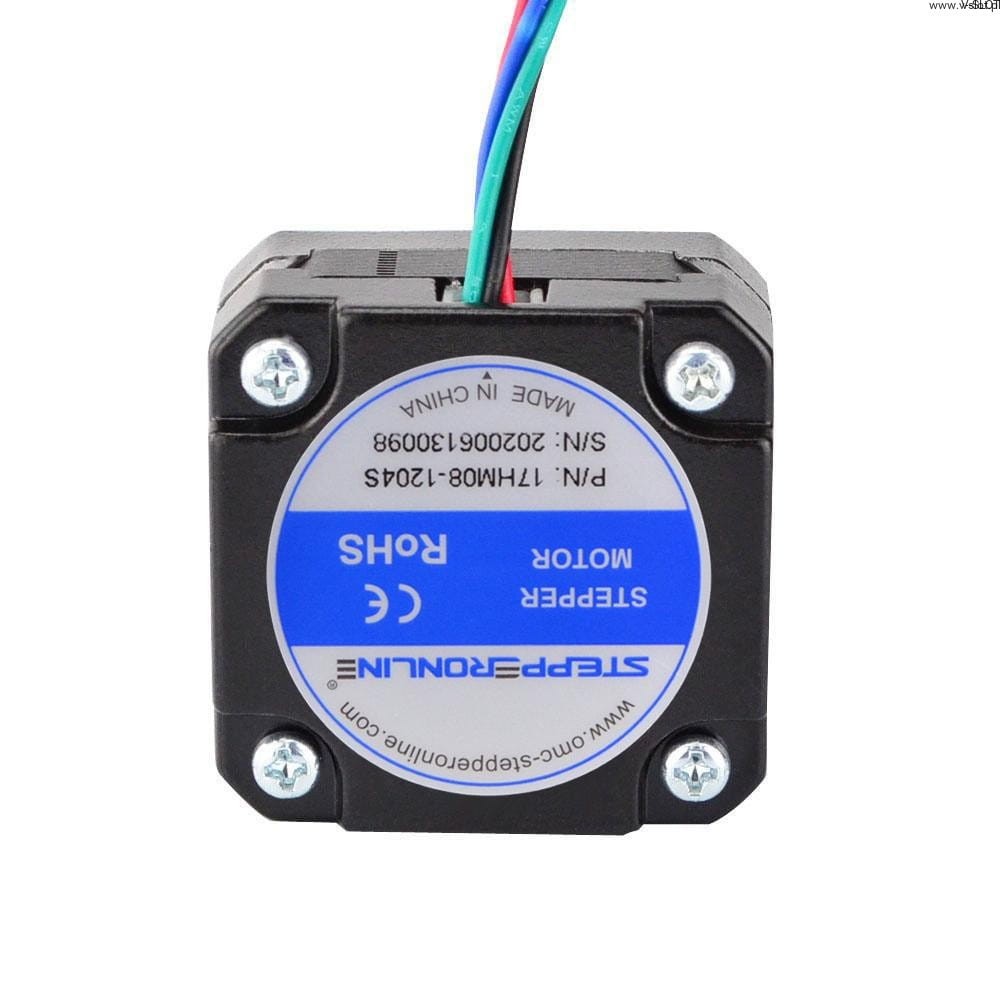 Dvoupólový krokový motor Nema 17 má úhel kroku 0,9 stupně a rozměry 42x42x21 mm. Má 4 vývody, každá fáze odebírá proud 1,2 A s přídržným momentem 11 Ncm.