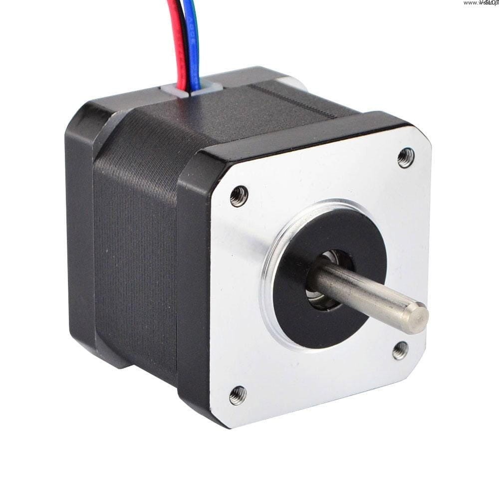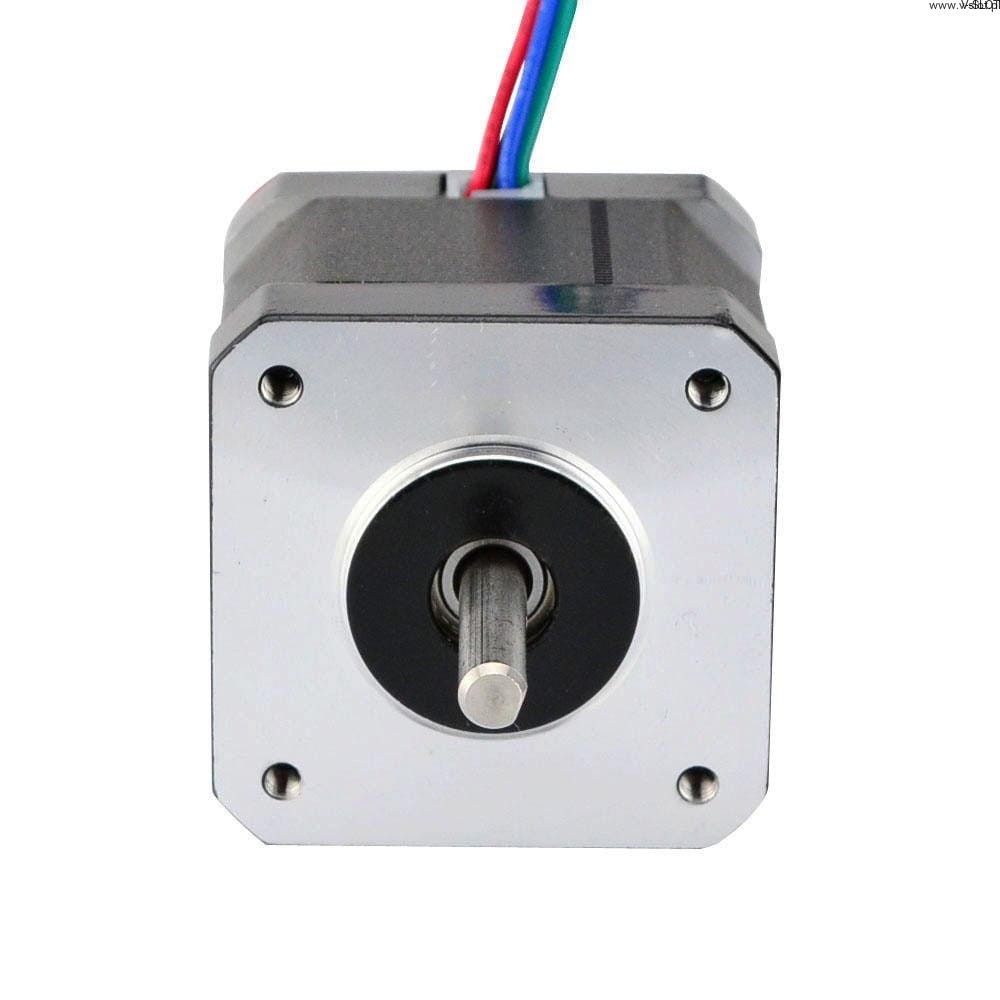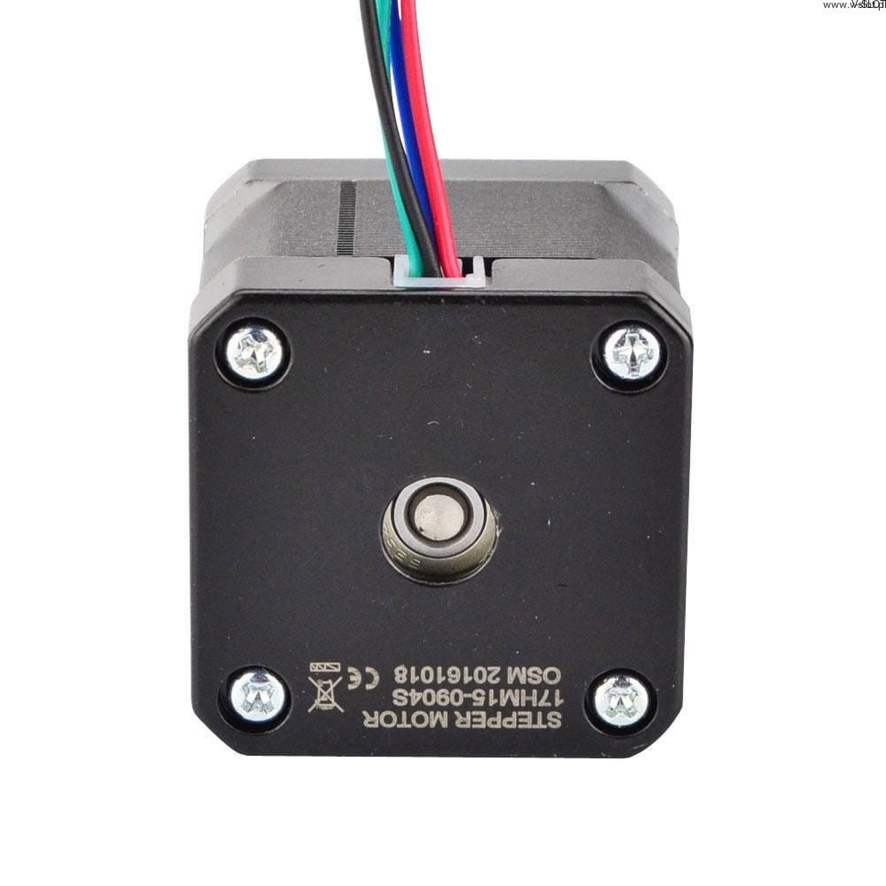 Dvoupólový krokový motor Nema 17 má úhel kroku 0,9 stupně a rozměry 42x42x39 mm. Má 4 vývody, každá fáze odebírá proud 0,9 A s přídržným momentem 36 Ncm.