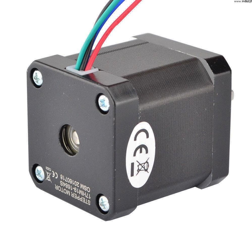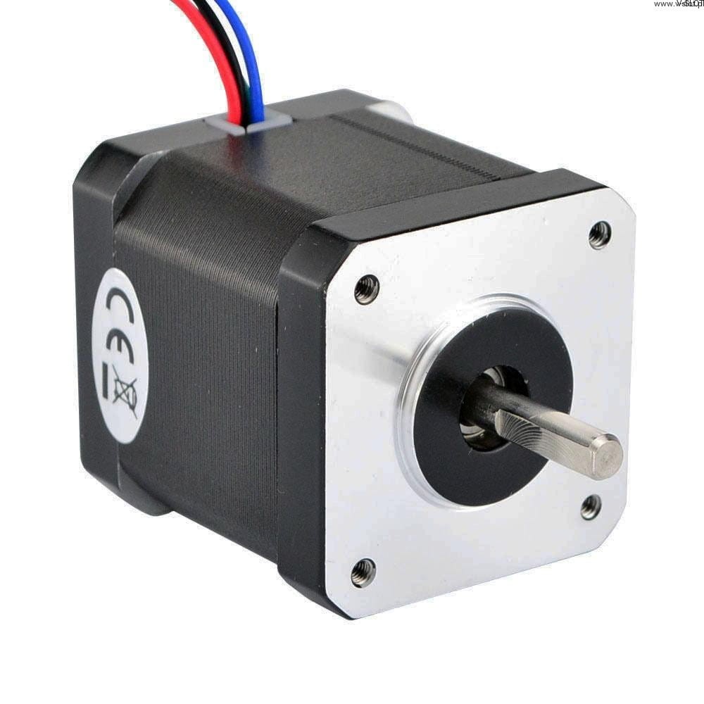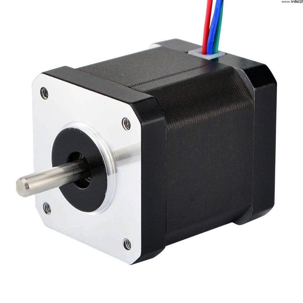 Dvoupólový krokový motor Nema 17 má úhel kroku 0,9 stupně a rozměry 42x42x47 mm. Má 4 vývody, každá fáze odebírá 1,68 A s přídržným momentem 44 Ncm.