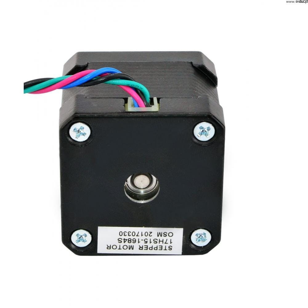 Dvoupólový krokový motor Nema 17 má úhel kroku 1,8 stupně a rozměry 42x42x39 mm. Má 4 vývody, každá fáze odebírá 1,68 A, s přídržným momentem 36 Ncm (51oz.in).