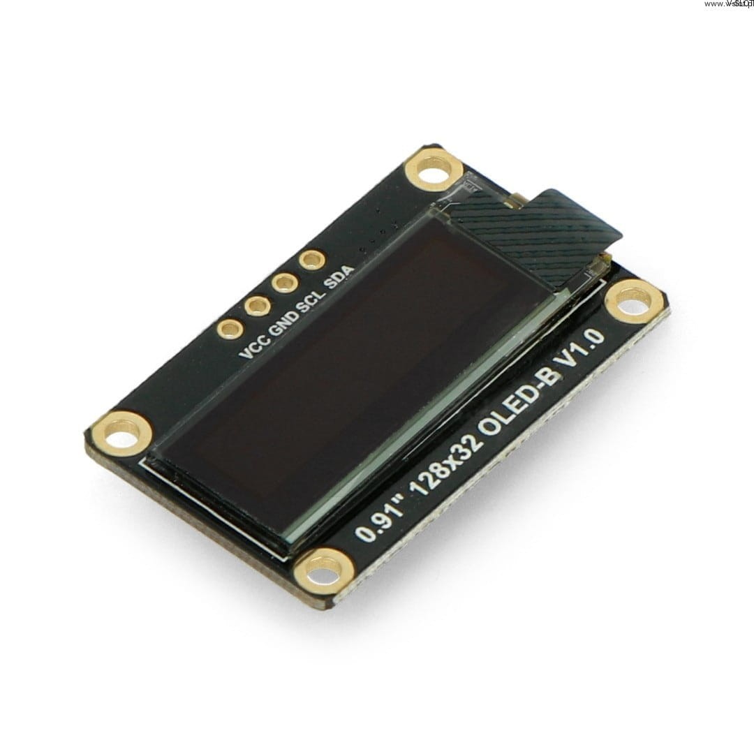 GrafickĂ˝ displej OLED s bĂlĂ˝mi znaky na ÄŤernĂ©m pozadĂ, monochromatickĂ˝, má ĂşhlopĹ™ĂÄŤku 0,91" a rozlišenĂ 128 x 32 px. Pro komunikaci pĹ™es rozhranĂ I2C pouĹľĂvá ÄŤip SSD1306. Displej se vyznaÄŤuje jednoduchĂ˝m pĹ™ipojenĂm k mikrokontrolĂ©ru a nĂzkou spotĹ™ebou energie. Je napájena napÄ›tĂm 3,3 V aĹľ 5 V. KompatibilnĂ je mimo jinĂ© se systĂ©my Arduino, ESP32 a FireBeetle.