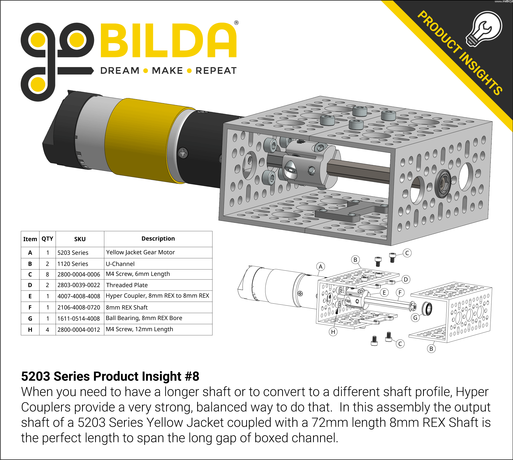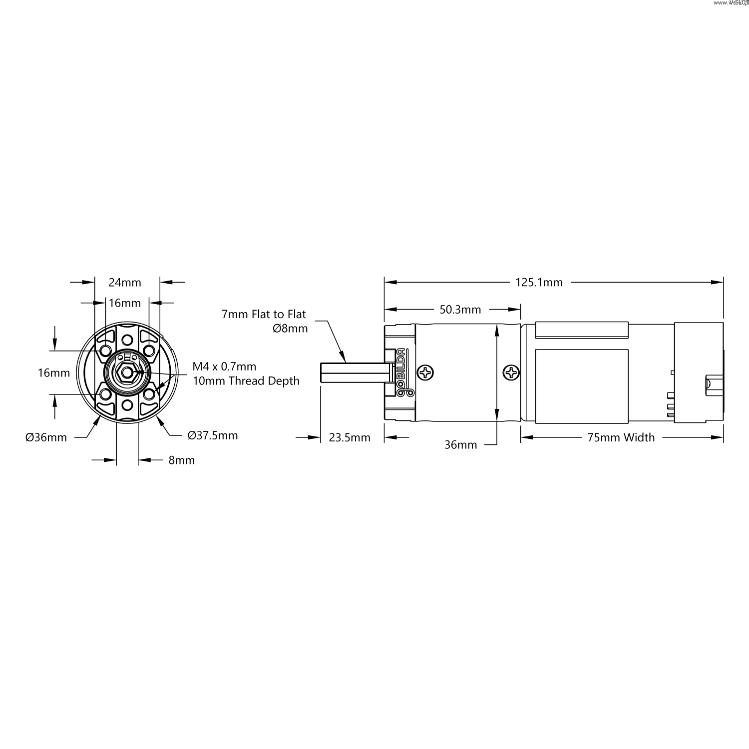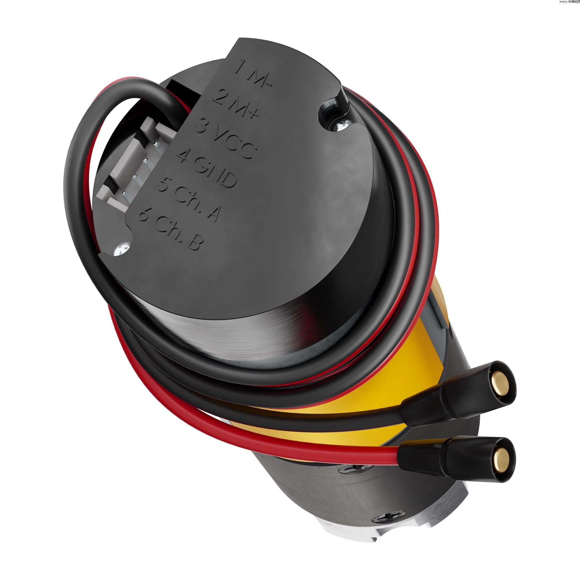 Planetový převodový motor se žlutým krytem řady 5203 (převodový poměr 139: 1, délka 24 mm, hřídel REX 8 mm, 43 ot/min, snímač 3,3 - 5 V)
