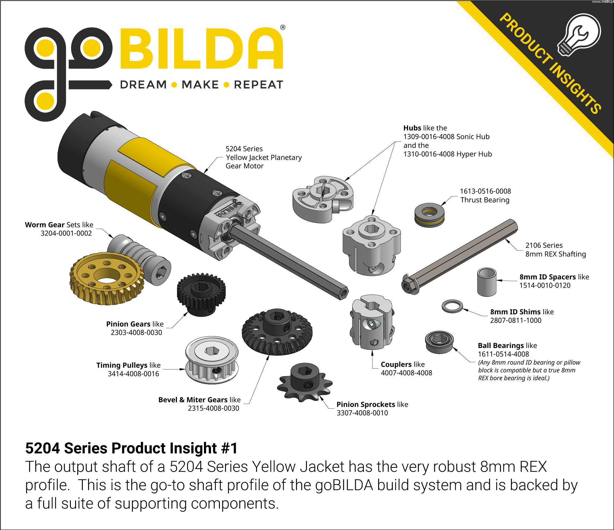 Planetový převodový motor se žlutým krytem řady 5204 (převodový poměr 188:1, délka 80 mm, hřídel REX 8 mm, 30 ot/min, snímač 3,3 - 5 V)