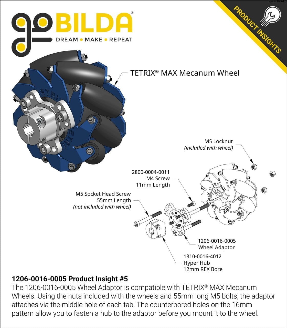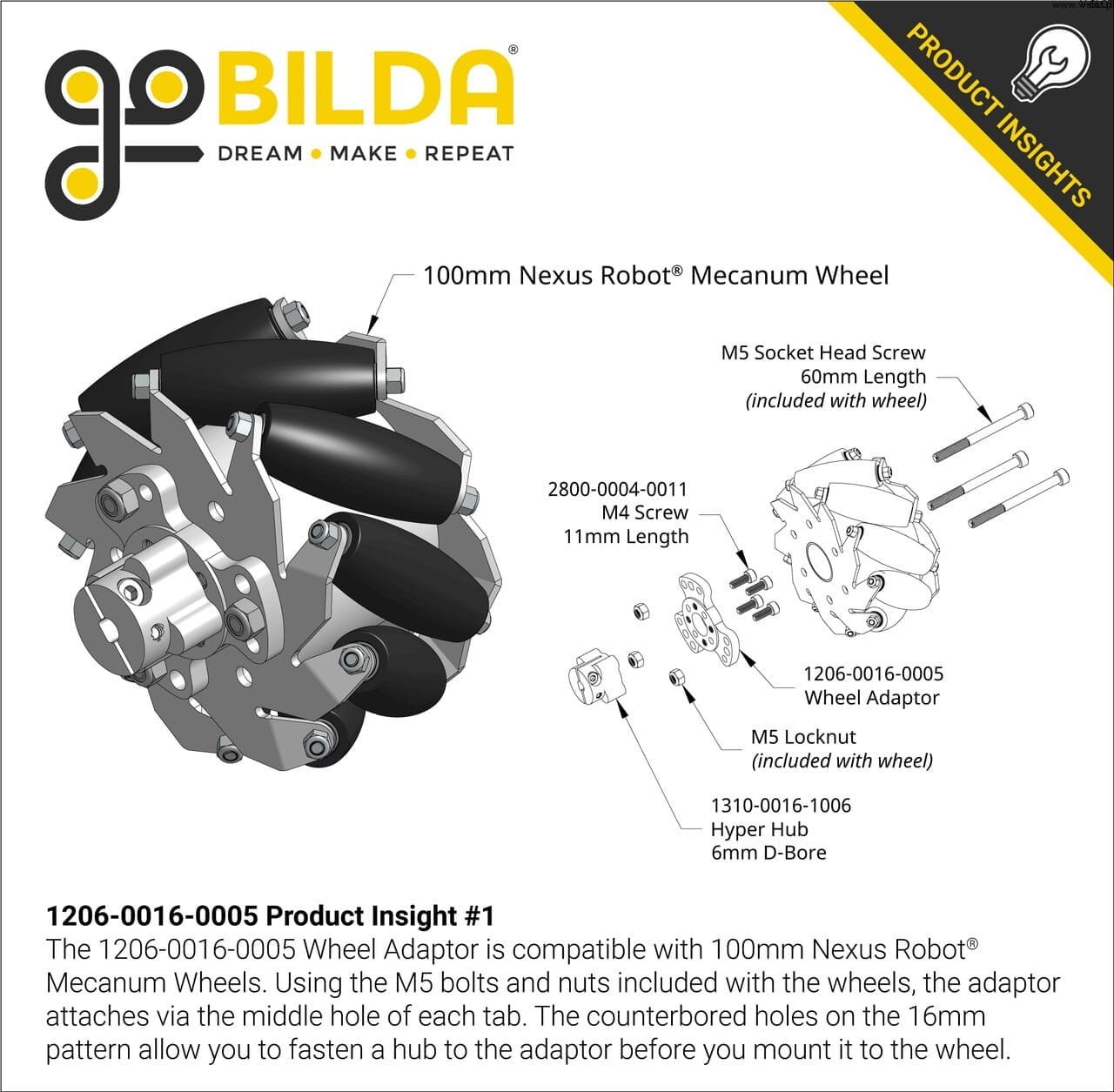 -Adaptér má ve středu 16mm vzorek goBILDA, takže na střed lze připevnit náboj nebo součástku pro pohon vybraného kola. -Každá záložka na adaptéru má tři různé otvory, každý s mírně odlišným průměrem a průměrem vzorku, aby se přizpůsobily známým kompatibilním kolům. Řada systémů GoBuilda umožňuje vytvářet mnoho jedinečných řešení.