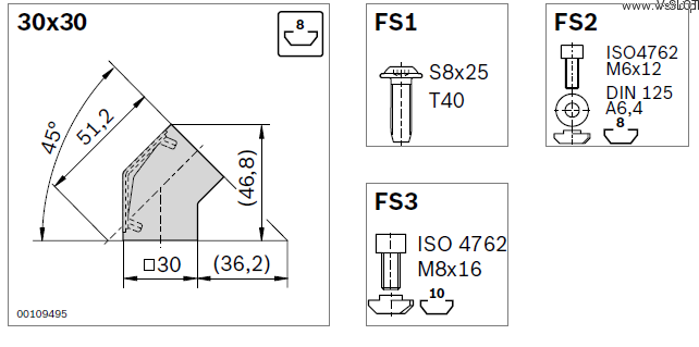 Úhlový konektor 45 stupňů 30x30 sada Bosch rexroth