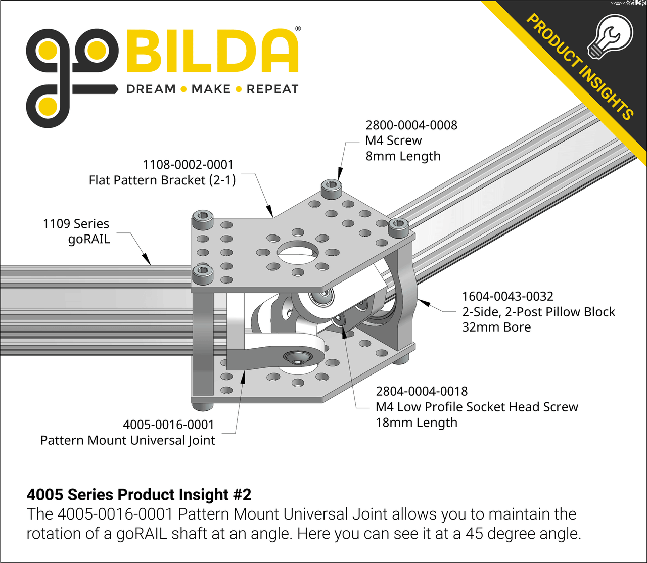 Tento kloub je větším bratrem univerzálního kloubu 4003-1006-1006. Jak již název napovídá, tento kloub je schopen připojit 16mm goBILDA a vytvořit tak velké a robustní rotační sestavy. Každý šroub M4 prochází kuličkovým ložiskem o vnitřním průměru 4 mm, aby byl zachován nízký koeficient tření.