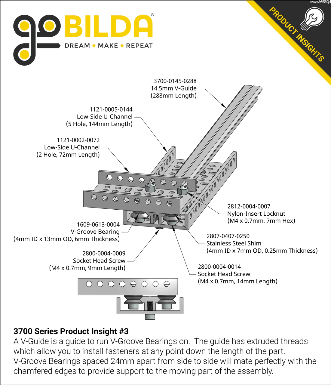 Vodítka V-kolo jsou navržena pro práci s ložisky s V-drážkou i s W-kolo. Po celé délce mají drážky velikosti M4, které umožňují zašroubování šroubů M4 kdekoli podél vedení.